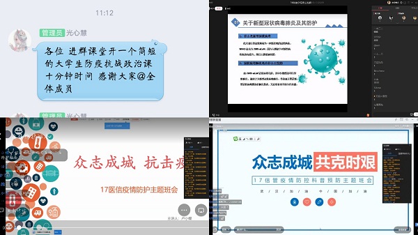 各师生党员立足班级特点和工作重点,通过多种线上平台向学生传达疫情防控的进度和日常防护的注意事项,从宣传抗疫到学校相关通知,帮助同学们增强责任意识、纪律意识、组织意识和防护意识。