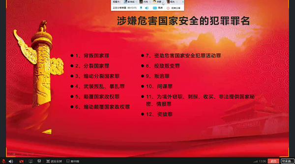 在开展国家安全法律法规学习教育活动环节中,各班要求同学们认真利用学习强国、学习通等平台,通过网上学习的形式,有针对性地加大对《国家安全法》、《反恐怖主义法》、《反分裂国家法》、《反间谍法》以及《中华人民共和国境外非政府组织境内活动管理法》等国家安全相关法律法规的学习教育力度,使广大师生在教育活动中普遍掌握安全知识、提升国家安全意识。在国家安全主题宣传教育活动环节中,各班根据实际,通过微信、QQ等网络媒体、设置宣传专栏、悬挂宣传标语、电子屏宣传、线上观看警示教育片等形式,开展宣传教育活动,切实增强广大师生维护国家安全和社会稳定能力。