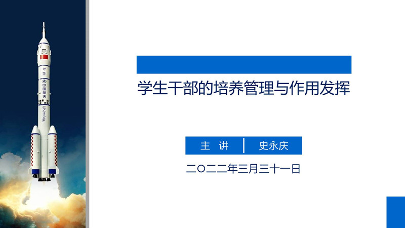 史永庆以“学生干部的培养管理与作用发挥”主题,要求学生干部要明确自身特性和角色定位,加强自身理论学习与政策水平,不断提升组织、协调、沟通、服务能力,强化思想意识,细化职责分工,创新工作方法,发挥积极作用,着力成为一支政治素质高、业务能力强、工作态度好、群众基础牢的学生干部队伍。