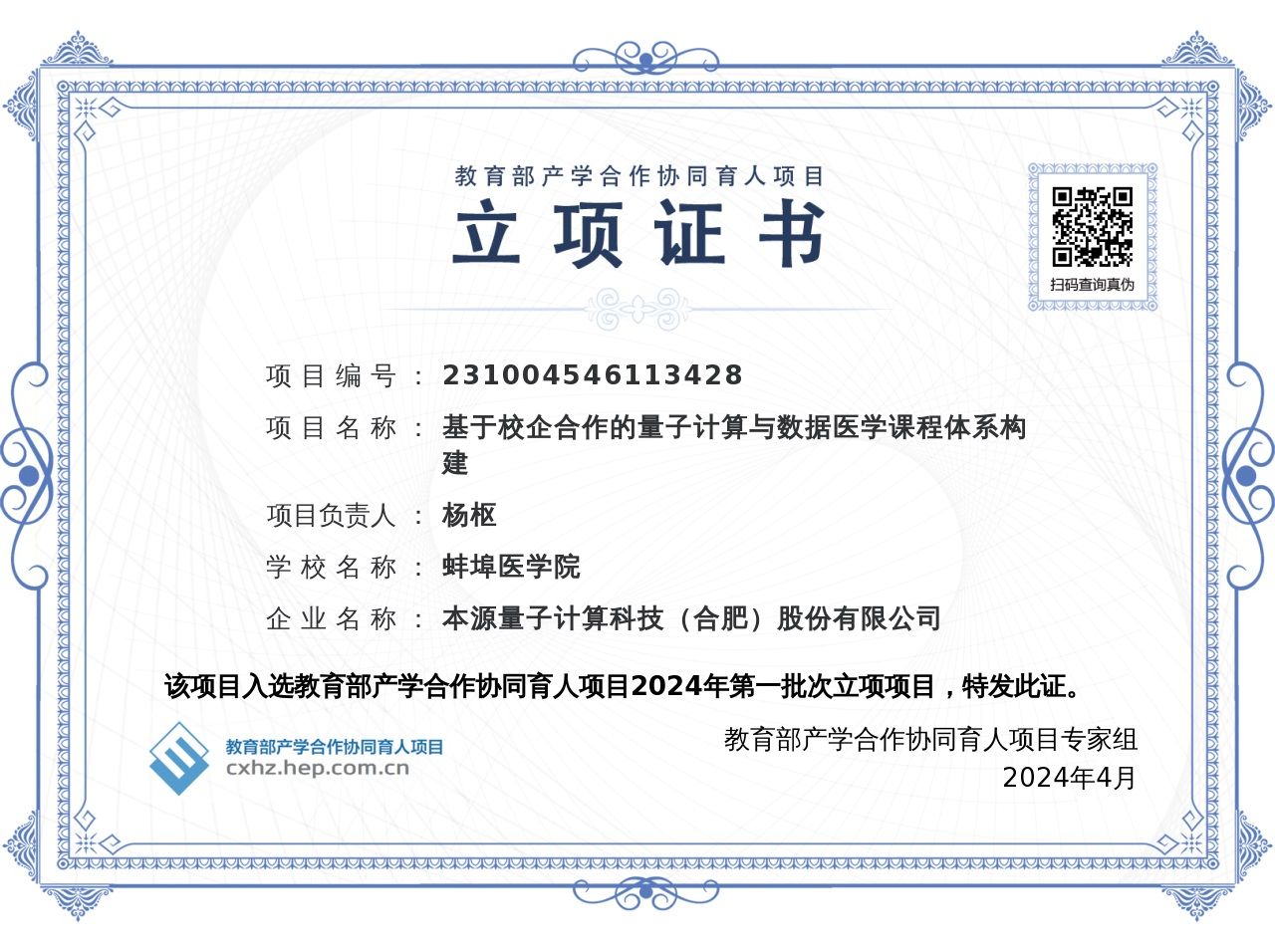 4月17日,教育部高等教育司公布2024年第一批产学合作协同育人项目立项名单,卫生管理学院杨枢教授申报的《基于校企合作的量子计算与数据医学课程体系构建》获批立项,该项目旨在普及量子计算理念,利用量子计算优势挖掘医学大数据资源,培养学生运用量子计算解决医学大数据领域实际问题的能力,提升高素质复合型人才培养水平。这是学院教师在安徽省质量工程“四新”研究与改革实践项目——《量子计算与数据医学在医学类专业教育中的实施路径研究》立项基础上与本源量子计算科技(合肥)股份有限公司的进一步深入合作。