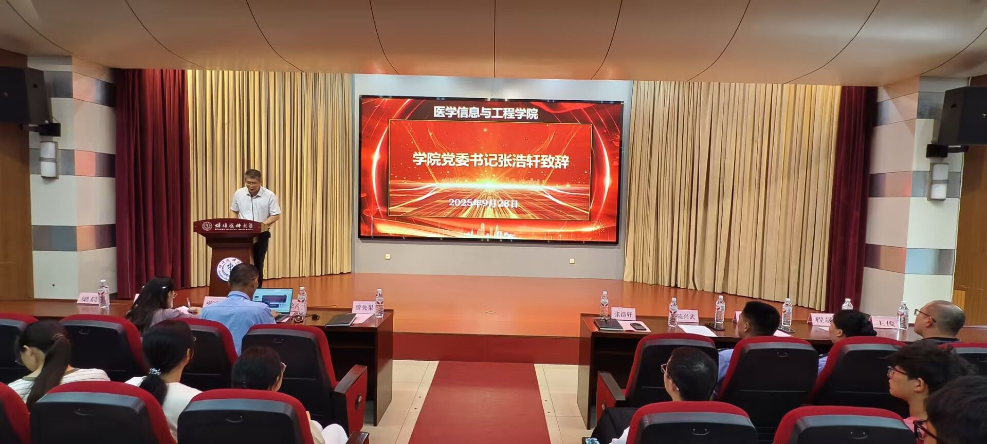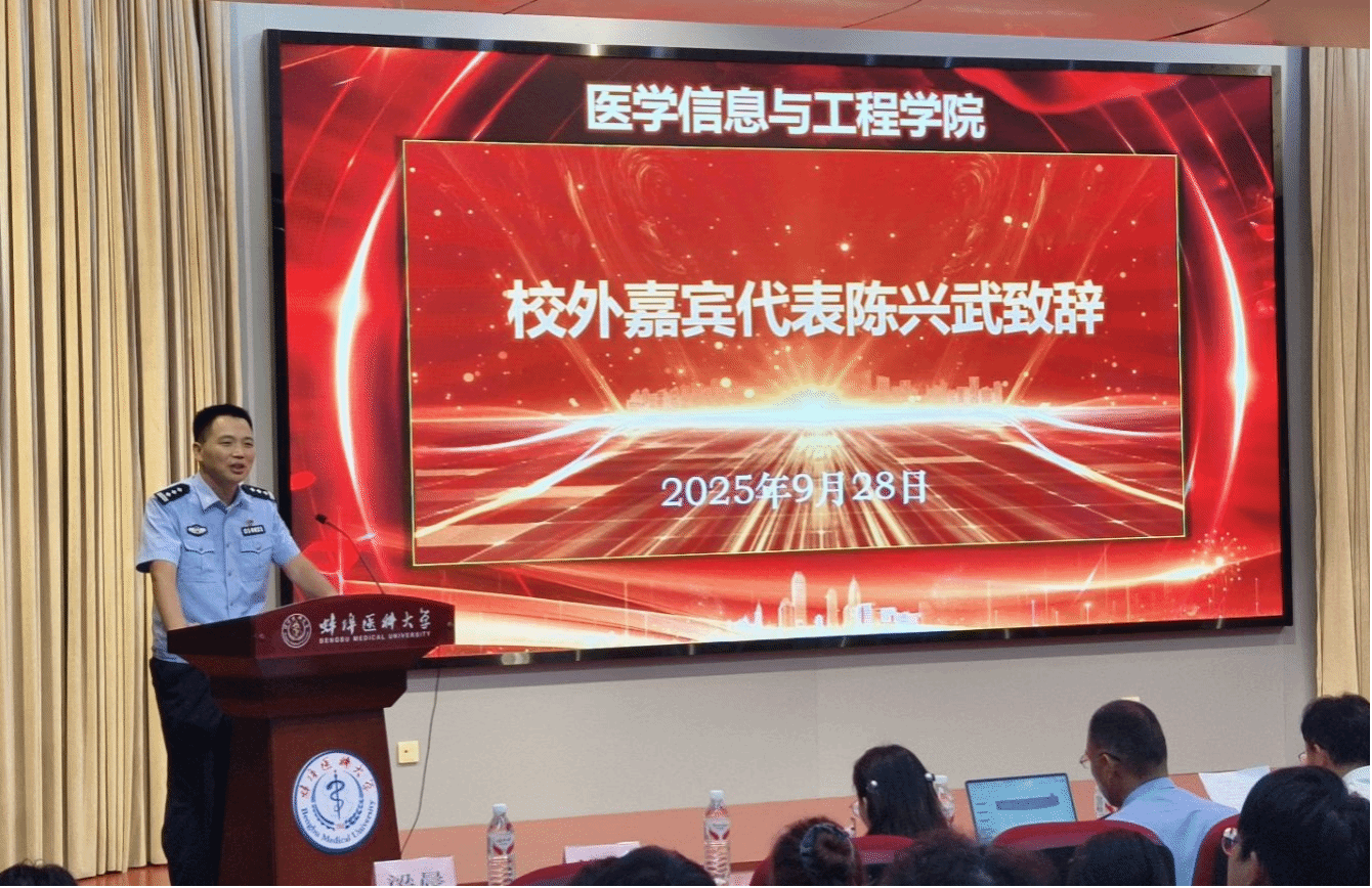 张浩轩在致辞中指出医学信息与工程领域既需过硬专业技术,更离不开法治思想保障。开展学生法治素养提升行动,旨在帮助同学们明确法律边界、增强维权意识,守护个人成长,为未来投身医疗事业、坚守职业底线筑牢基础。同时,他还从学科布局、师资队伍、科研平台和人才培养等维度,全面介绍了学院的特色与成果,勉励新生快速转变角色,尽快适应大学环境。