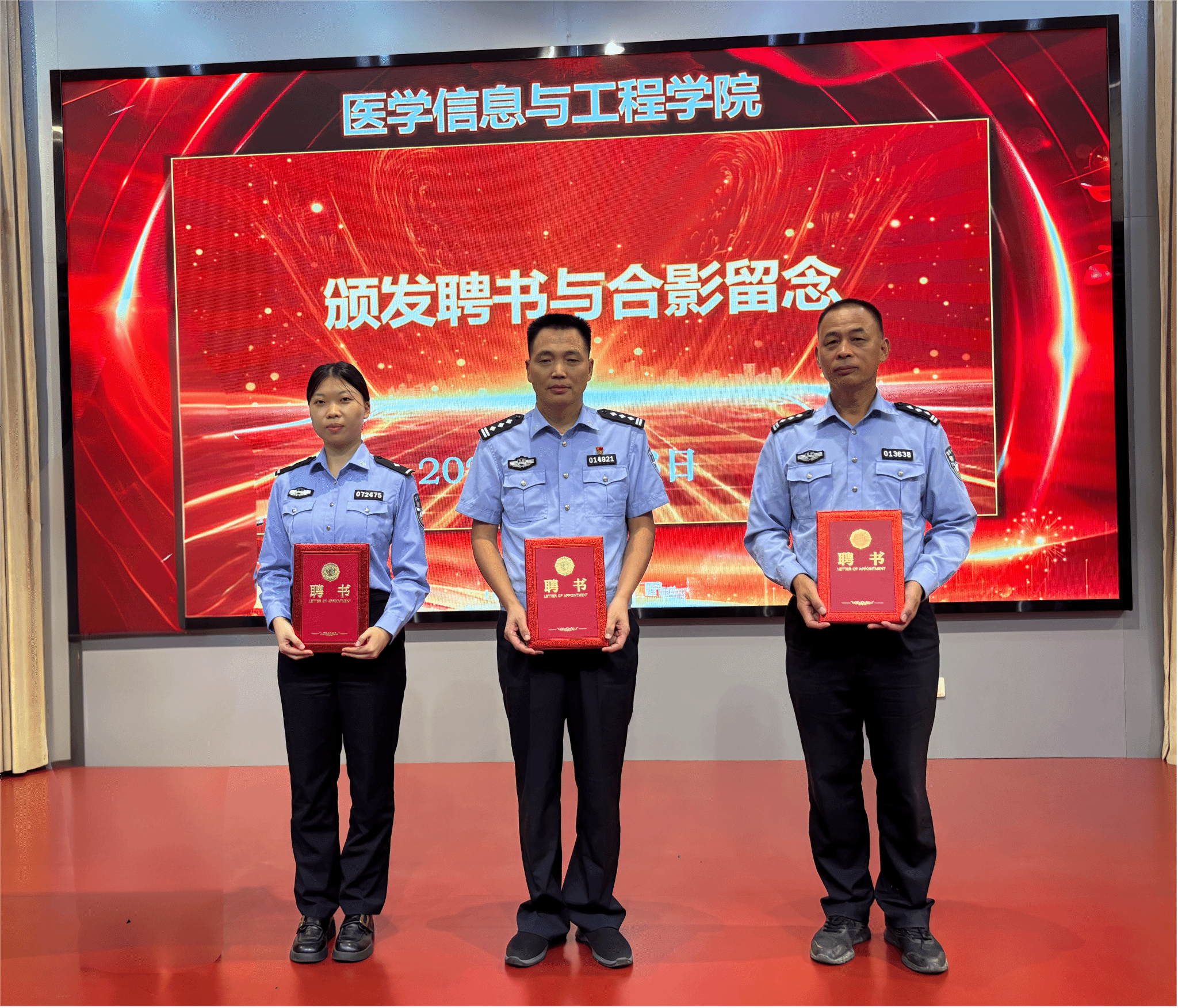 现场还举行了聘书颁发仪式,聘任龙子湖公安分局指挥中心主任、蚌埠大学城“陈兴武工作室”负责人、全国公安机关成绩突出个人陈兴武为校外法治导师;聘任蚌埠市公安局龙子湖分局民警、“陈兴武工作室”成员王之高、陈欣雨为校外法治辅导员。学院从大二、大三年级选拔聘任了第一批校内法治宣传员。