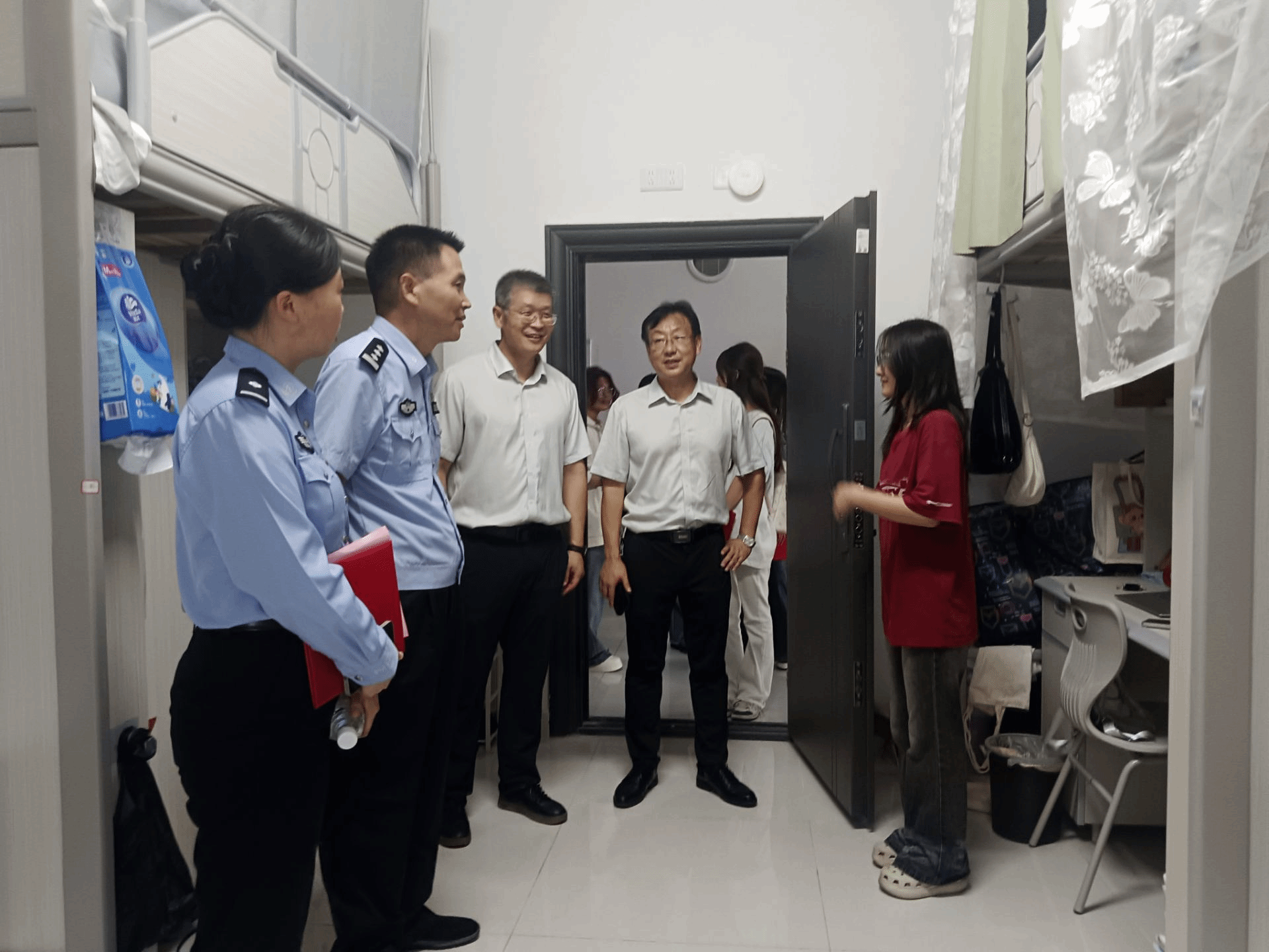 会议结束后,校外法治导师、法治辅导员在学院领导的陪同下,走访学生宿舍。过程中,不仅强调了学生安全注意事项,还结合实际场景开展现场法治宣讲,让法治教育更贴近学生生活。