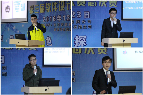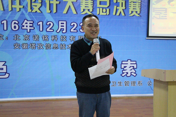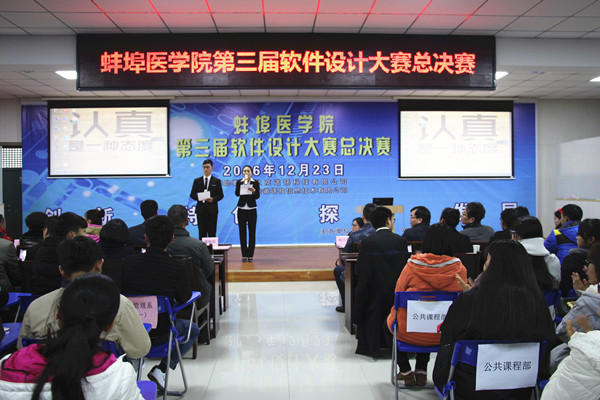 12月23日下午,蚌埠医学院第三届软件设计大赛总决赛在G1教室隆重举行。大赛由卫生管理系和公共课程部共同主办。教务处处长吴俊英、科研处处长王震寰、学生处处长王魁、团委副书记周静到现场观摩指导。为规范比赛,大赛邀请了生物科学系吴守伟,公共课程部朱文婕、张德成,卫生管理系杨枢、时从政、王辅之六位教师和校IT协会同学担任大赛评委。北京诺名科技有限公司和安徽塔孜信息技术有限公司为本次大赛提供了经费支持。