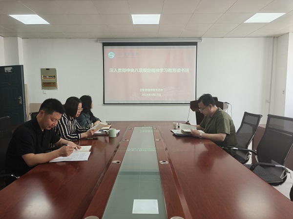 4月14日至17日,卫生管理学院党总支举办深入贯彻中央八项规定精神学习教育读书班,学院党总支委员、党支部书记参加会议,会议由党总支副书记贾先果主持。
